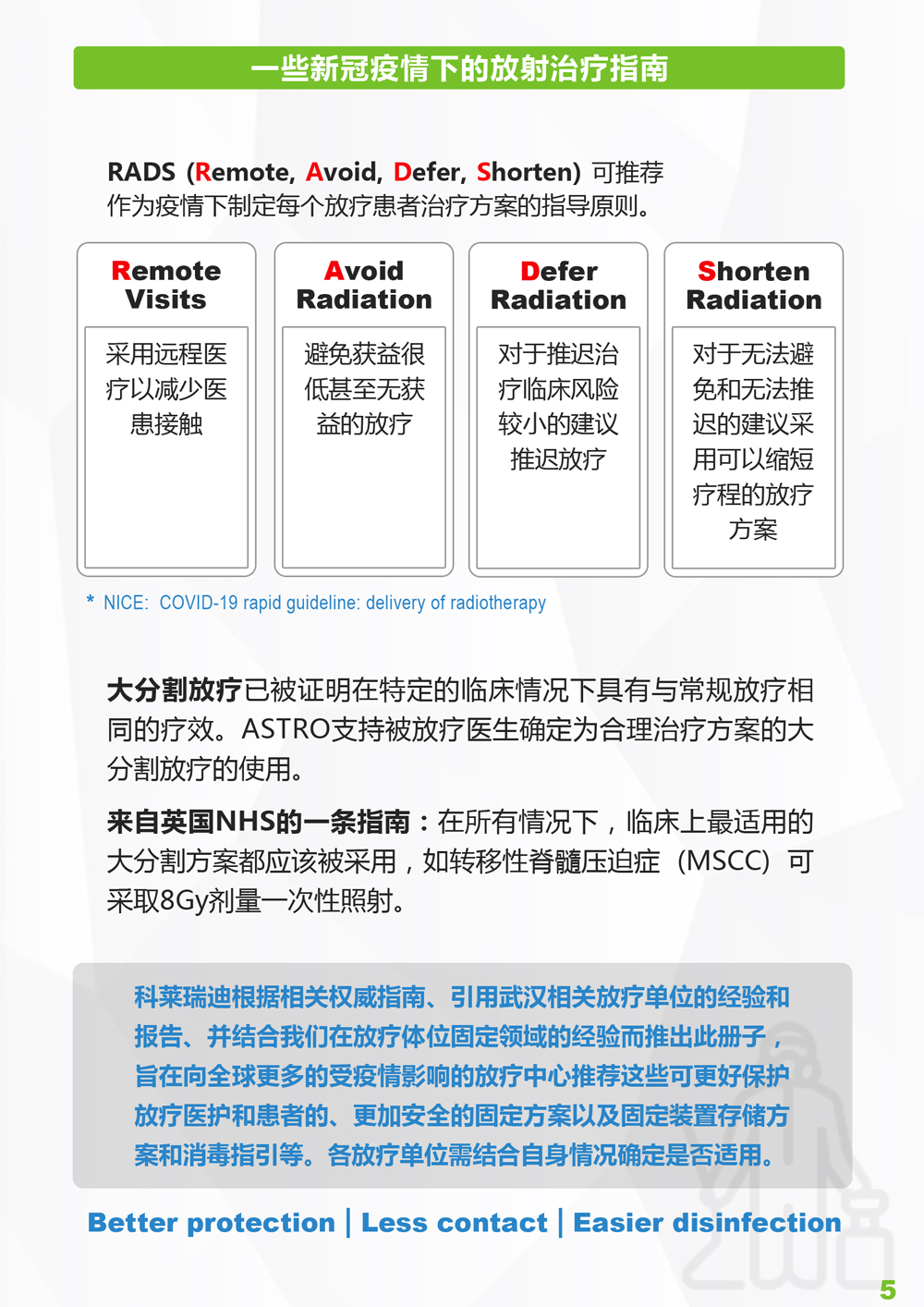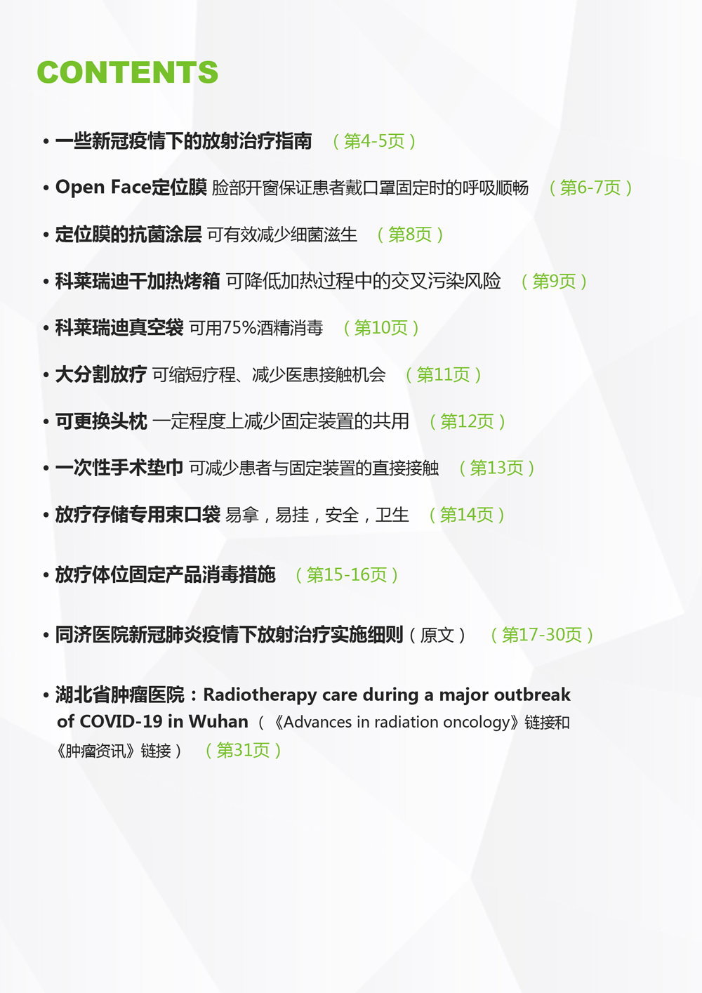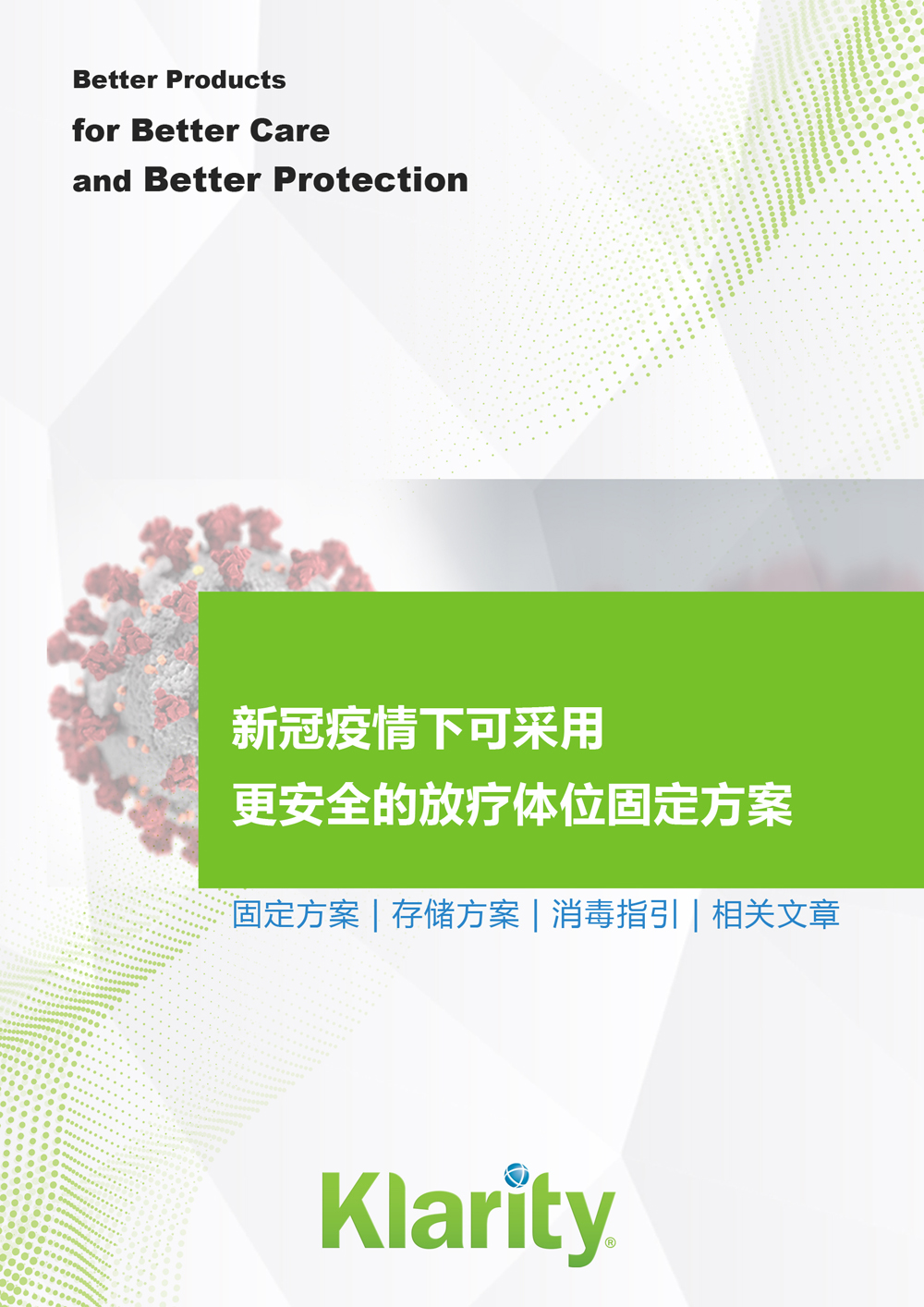 科莱瑞迪根据相关权威指南、引用武汉相关放疗单位的经验和报告、并结合我们在放疗体位固定领域的经验而推出此册子,旨在向全球更多的受疫情影响的放疗中心推荐这些可更好保护放疗医护和患者的、更加安全的固定方案以及固定装置存储方案和消毒指引等。各放疗单位需结合自身情况确定是否适用。