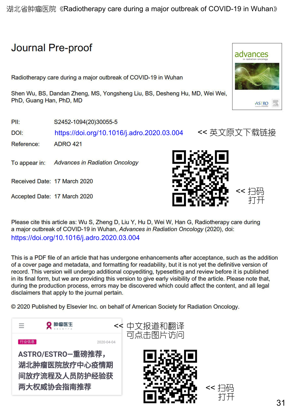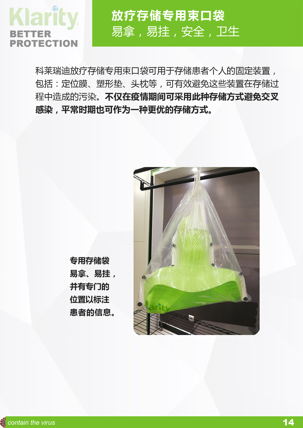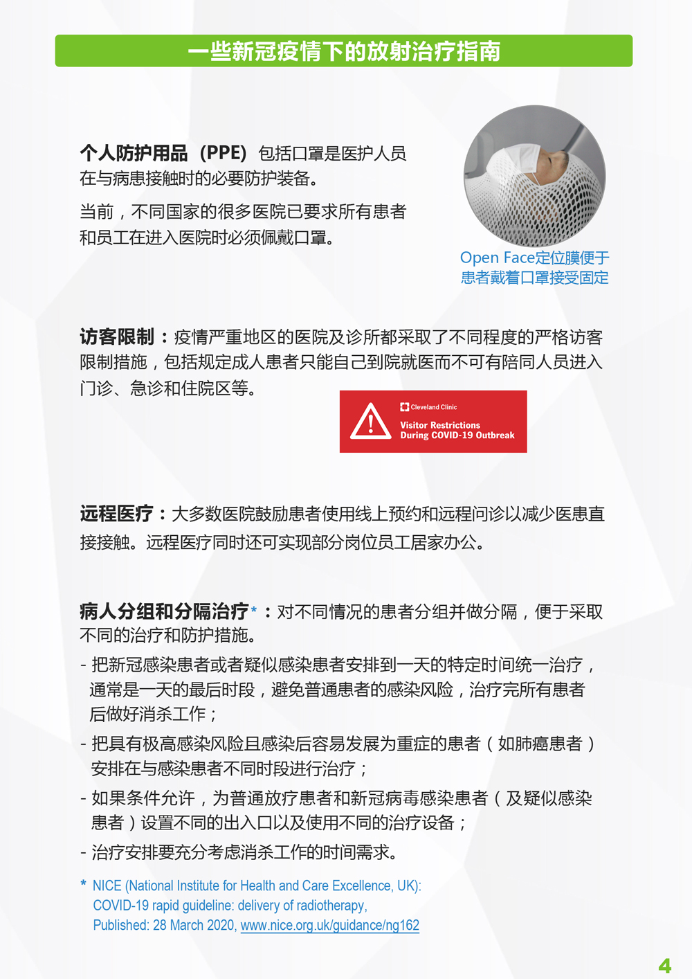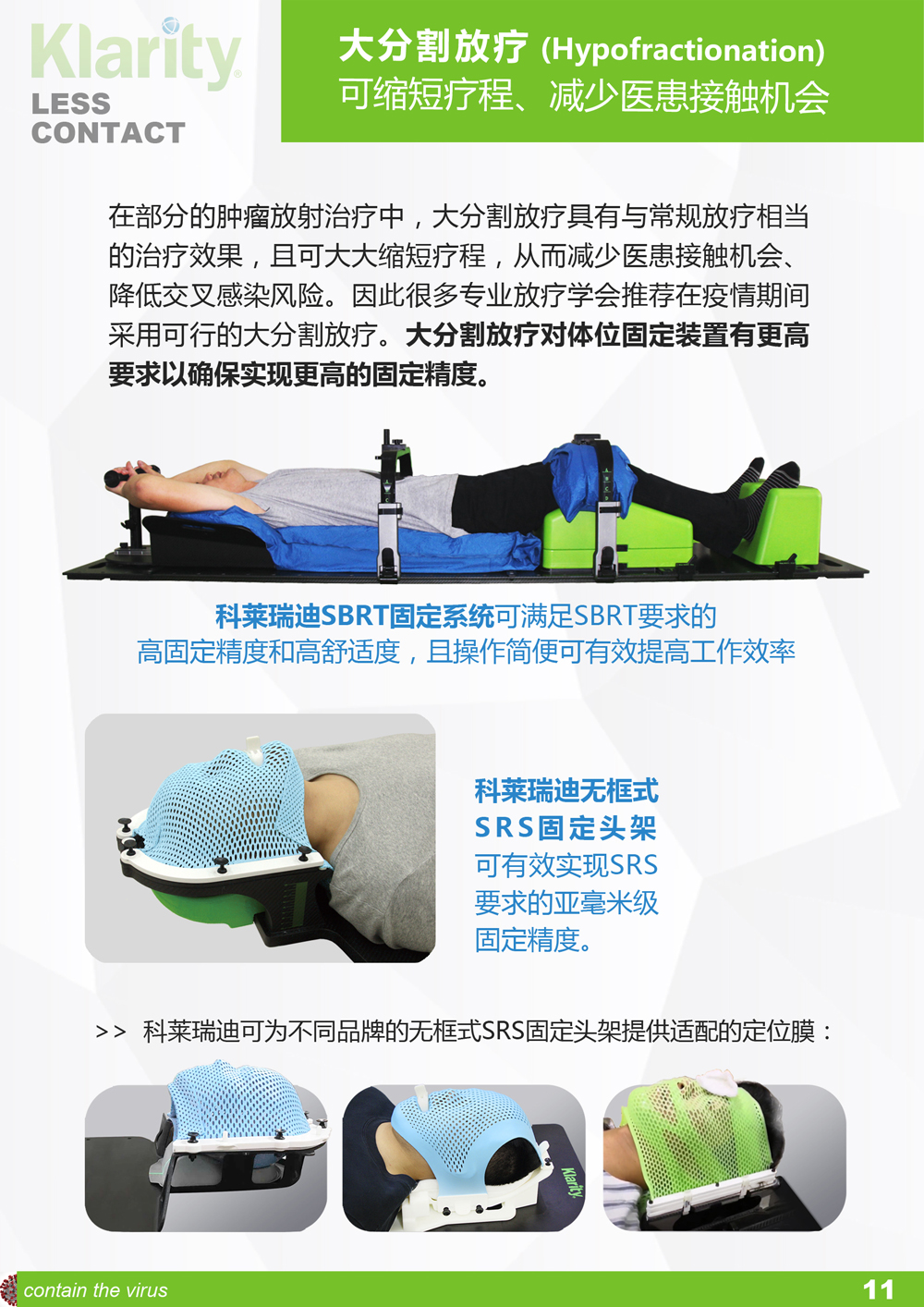 科莱瑞迪根据相关权威指南、引用武汉相关放疗单位的经验和报告、并结合我们在放疗体位固定领域的经验而推出此册子,旨在向全球更多的受疫情影响的放疗中心推荐这些可更好保护放疗医护和患者的、更加安全的固定方案以及固定装置存储方案和消毒指引等。各放疗单位需结合自身情况确定是否适用。